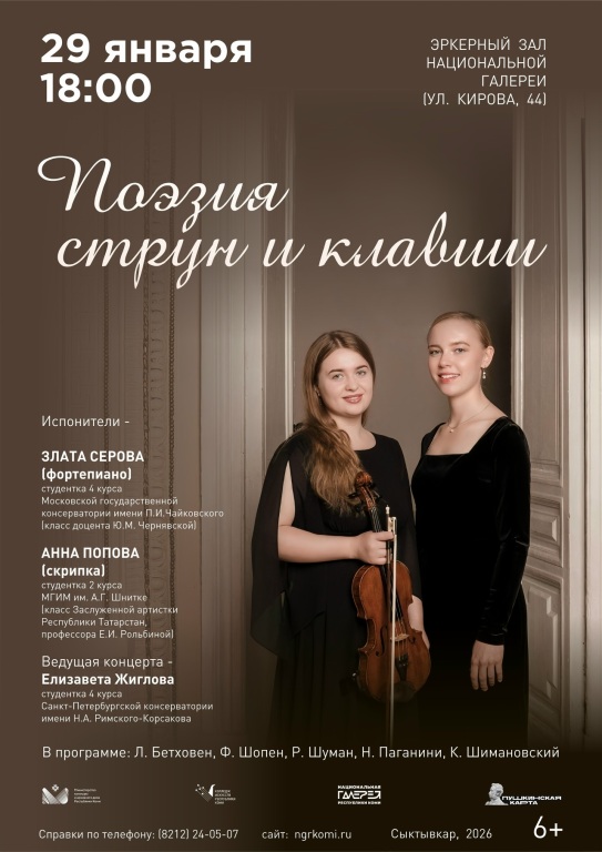 В исполнении выпускниц Колледжа искусств Республики Коми Златы Серовой, фортепиано, и Анны Поповой, скрипка, прозвучат произведения различных эпох – от Венского классицизма до музыки XX века. Слушатели познакомятся с великолепной музыкой Л. Бетховена, Ф. Шопена, Р. Шумана, Н. Паганини и К. Шимановского. Приглашаем всех любителей классического искусства совершить это невероятное путешествие по мировым музыкальным вехам!